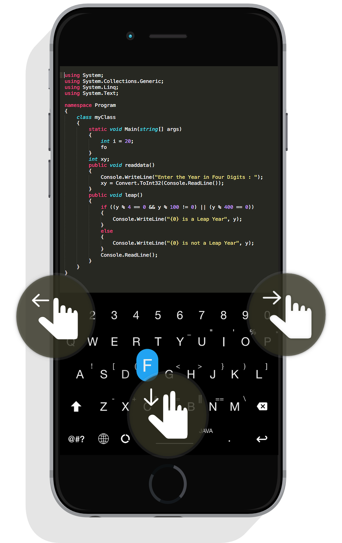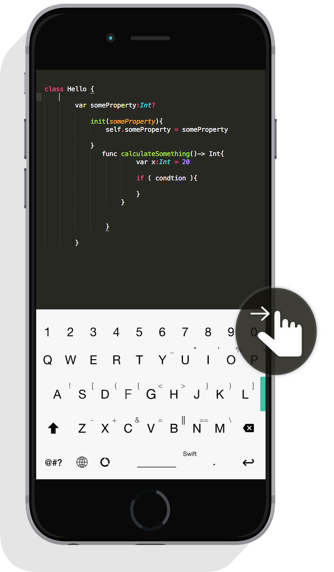 Codekey comes with tons of pre-defined syntax triggers, that can be activated using a simple right swipe. So if you want a "if" block, just type "if" and right swipe. Codekey will automatically create a "if ( condition ){ }" block for you. Same applies when you want to add "Switch" cases, "For" loops, Class body, methods declaration, functions declaration, interfaces, imports ! ..And It's completely hackable, so you have freedom to create your own trigger words.